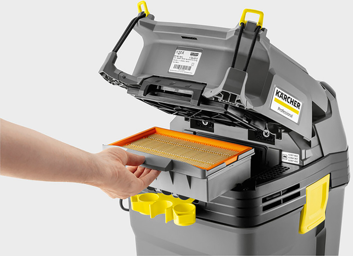 NT 30/1 Ap L – це компактний, високоякісний пилосос для вологого та сухого прибирання середнього класу з напівавтоматичним очищенням фільтра. Пилосос підходить для різних варіантів застосування, таких як очищення салонів автомобілів, видалення великих частинок бруду та рідин, а також очищення пилососом різноманітних машин та систем. Висока потужність всмоктування та ефективна система очищення фільтра дозволяє видаляти середні кількості дрібного пилу навіть без фільтр-мішків. Пилосос дуже простий в експлуатації завдяки використанню центрального поворотного перемикача. Для раціонального зберігання аксесуарів передбачені спеціальні відсіки на голові пилососа, а її плоска верхня частина дозволяє розміщувати та надійно закріплювати на ній ящик для інструментів.