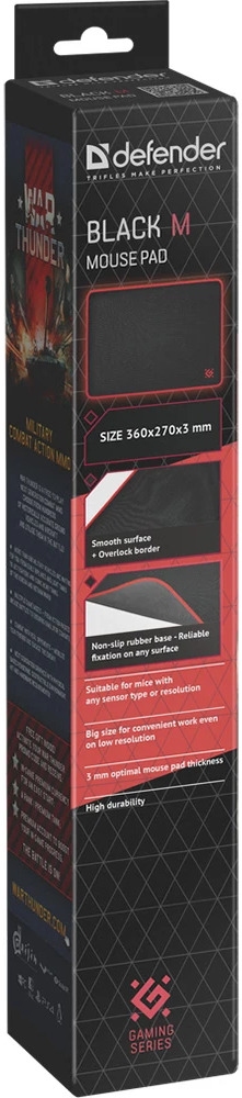 Килимок Defender M Black має розміри 360 мм у ширину, 270 мм у довжину та 3 мм у товщину, що забезпечує достатню площу для комфортного розміщення миші. Поверхня килимка виготовлена з високоякісної тканини, що забезпечує ідеальне ковзання миші та точність рухів. Матеріал основи — каучук, який запобігає ковзанню килимка по столу, забезпечуючи стабільність під час найінтенсивніших ігрових сесій.