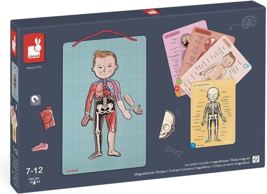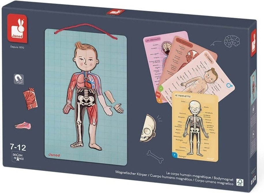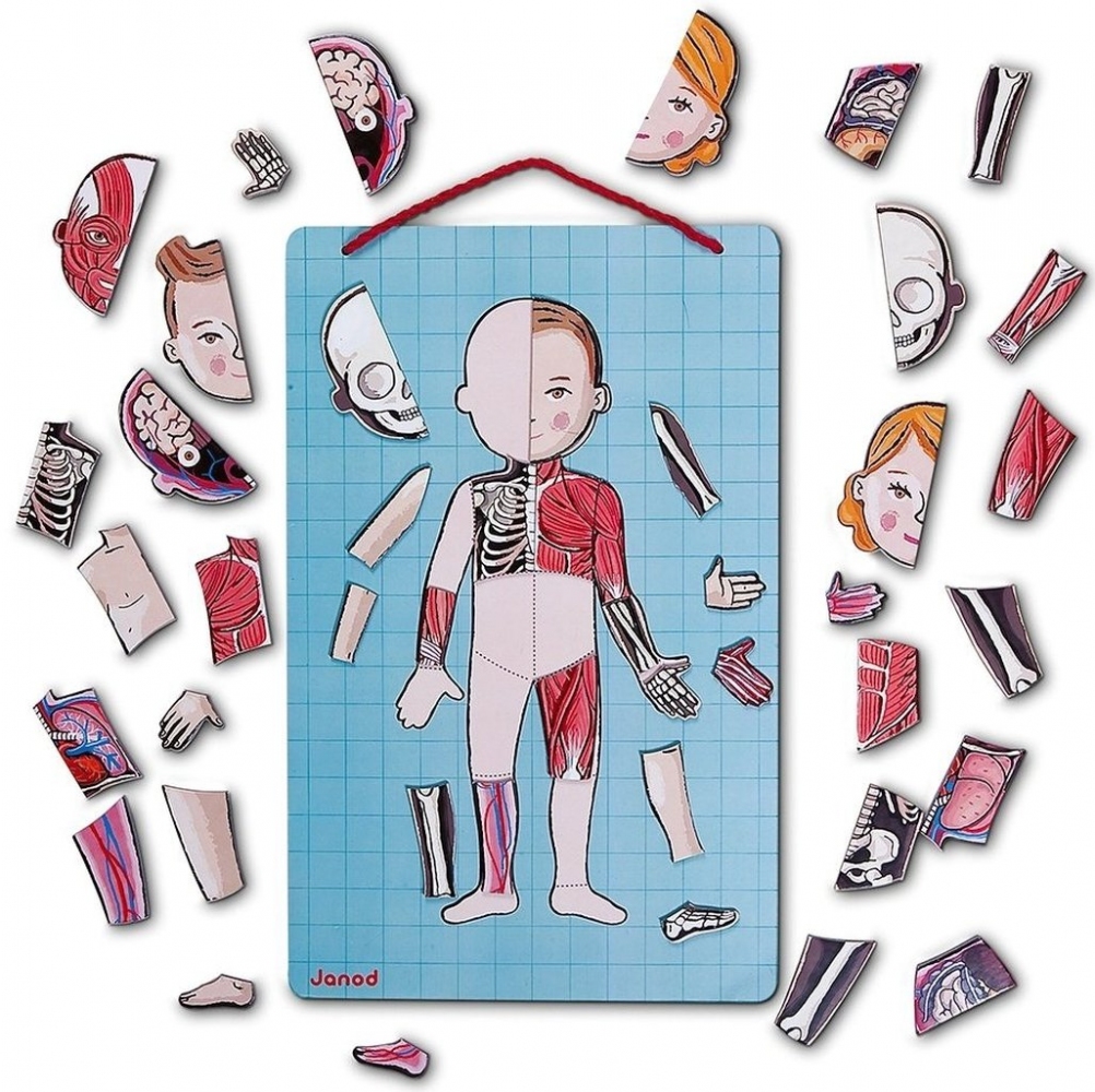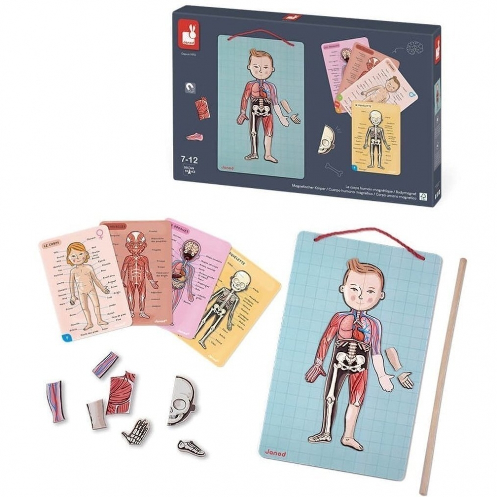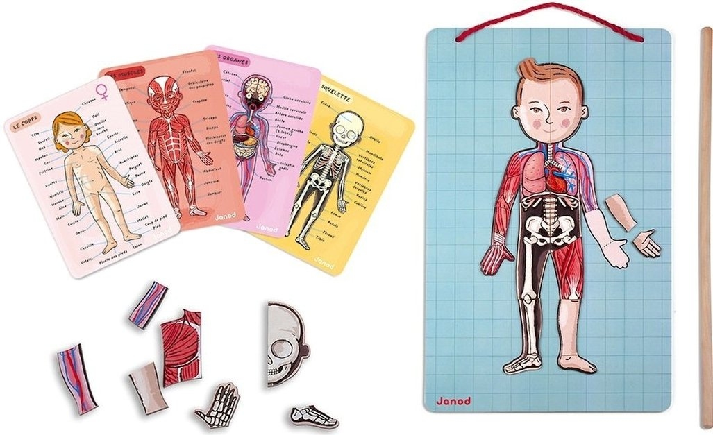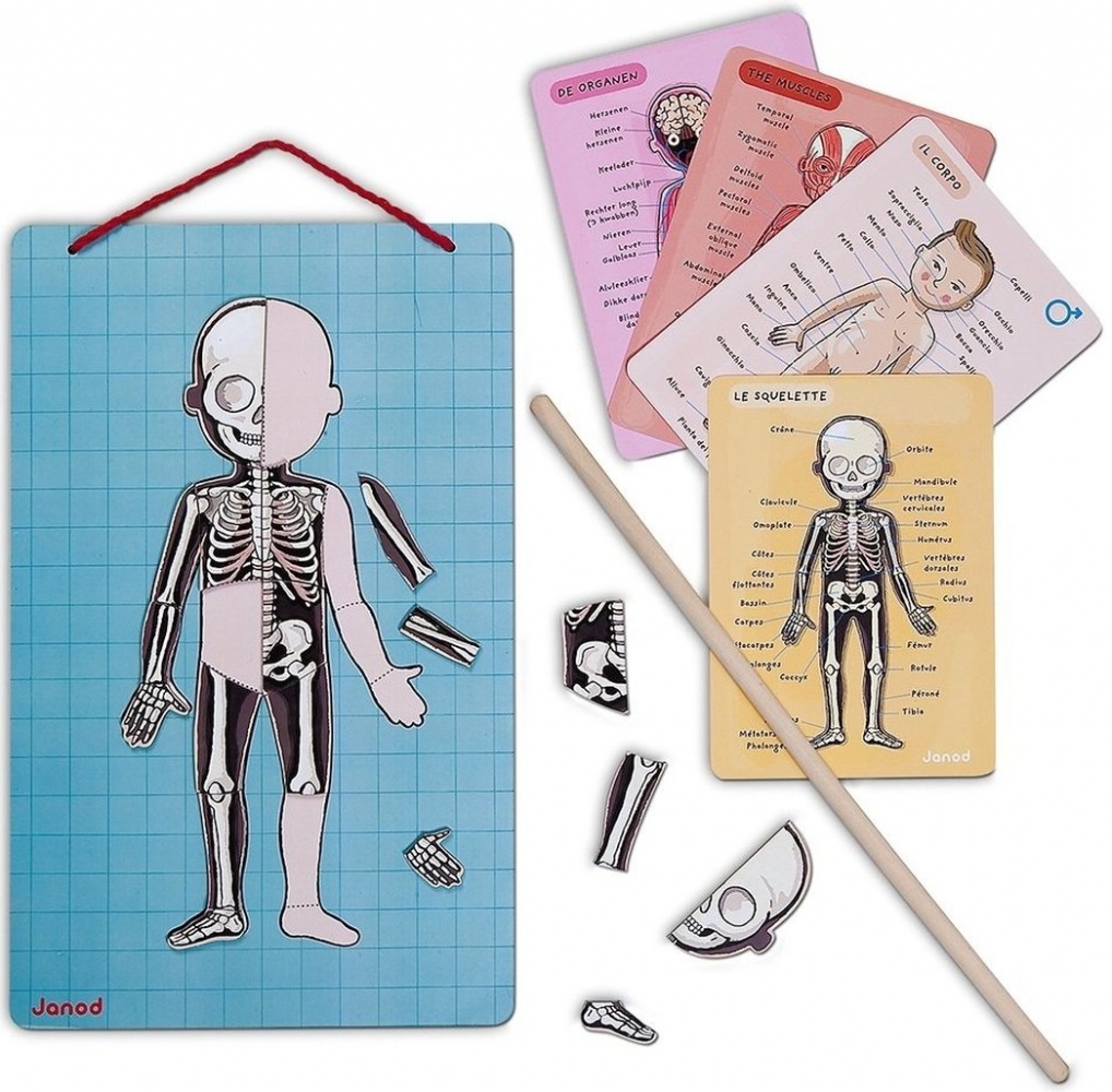 Вивчайте будова тіла людини в ігровій формі разом з магнітним набором від французького бренду Janod. 76 магнітних деталей і 1 дошка-основа для навчання і збору різних частин людського тіла. Гра пропонує скласти 4 карти людини в залежності від тематики: будова опорно-рухового апарату, будова м'язів, розміщення органів і судин, а також – тіло людини. У наборі – маленька дерев'яна указка. Батьки можуть для зручності повісити дошку-основу на стіні і розповідати дітям про будову людського тіла.
