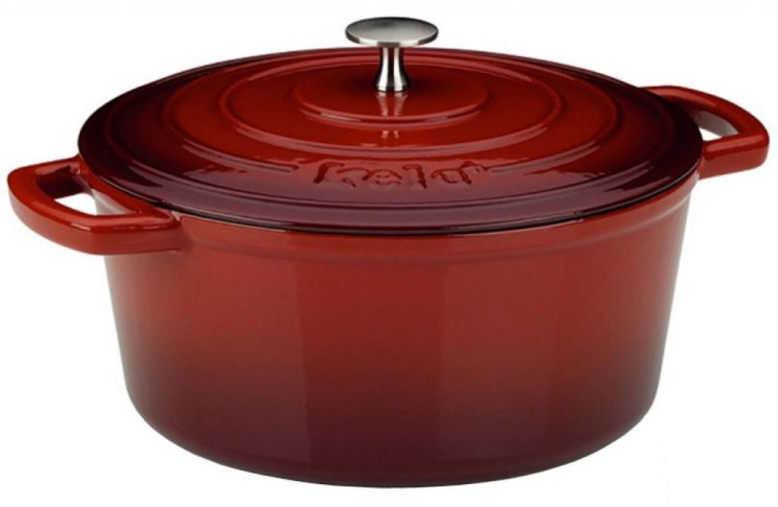 Червона каструля виготовлена з чавуну та покрита емаллю бежевого кольору всередині, має глянсове покриття.