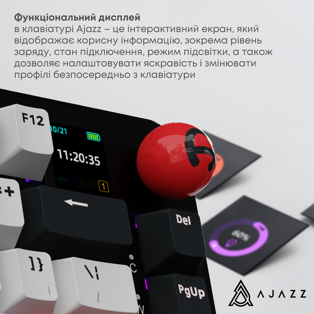 Клавіатура оснащена кольоровим TFT-дисплеєм, який дозволяє зручно керувати різними функціями без необхідності встановлення додаткового ПЗ. На дисплеї можна переглядати:- Домашній екран з поточним часом і статусом підключення