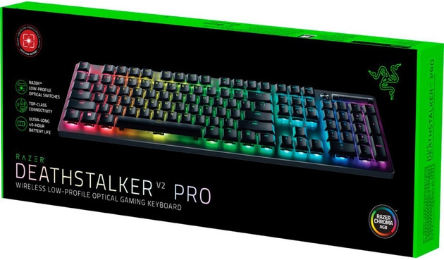 Зустрічайте Razer DeathStalker V2 Pro - надтонку бездротову оптичну клавіатуру, оптимізовану для забезпечення високої продуктивності та довговічності. Оснащена новими низькопрофільними перемикачами Razer™ та технологією бездротового зв'язку Razer™ HyperSpeed для надшвидкого ігрового процесу, клавіатура має міцний ультратонкий корпус для тривалого ергономічного використання.