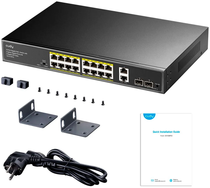 Некерований гігабітний PoE-комутатор Cudy GS1018PS2 оснащений 16 портами PoE+ 10/100/1000M, 2 портами Uplink 1000M, 2 гігабітними SFP-портами. Стандарт живлення PoE IEEE802.3af/at. Загальна потужність 200 Вт, 30 Вт на канал. Відстань PoE: до 100 м (макс. 1000 Мбіт/канал), 9-16 канали до 250 м (10 Mбіт/канал).