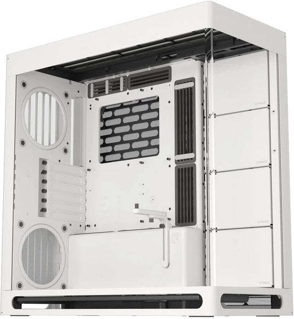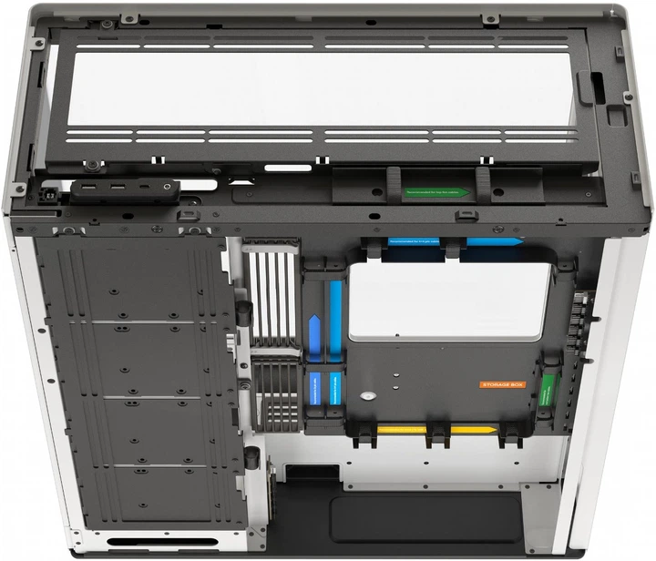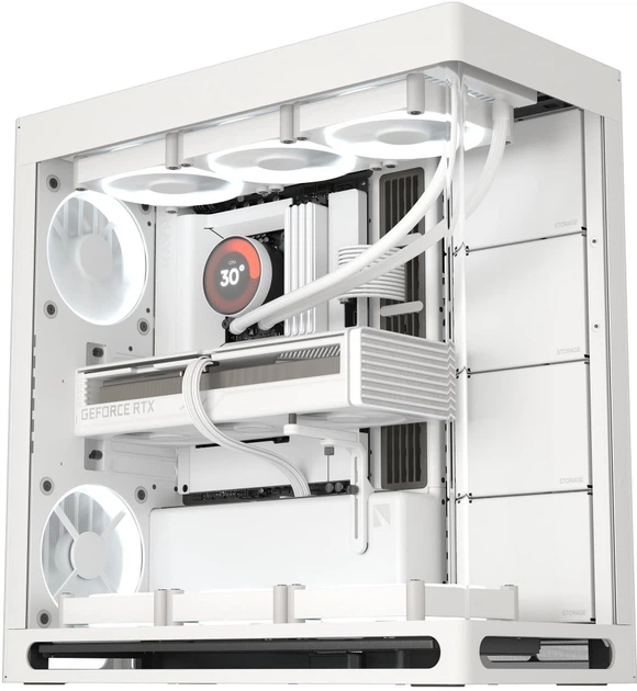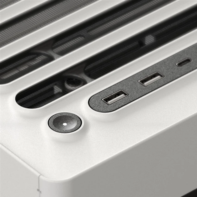 Дзеркальний потік повітря. Додатковий вентилятор у нижній частині задньої панелі спрямовує холодне повітря безпосередньо до відеокарти, ідеально балансуючи впуск і випуск повітря. Це забезпечує максимальну продуктивність і допомагає підтримувати чистоту системи без пилу. Термоформована скляна панель UniSheet для панорамного огляду. Було кинуто виклик обмеженням виробництва, щоб створити найменший можливий радіус вигину та мінімізувати візуальні спотворення, забезпечуючи користувачеві чіткий огляд внутрішньої частини корпусу. SimpliCable Routing System.