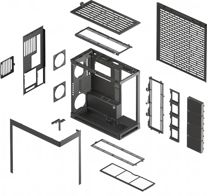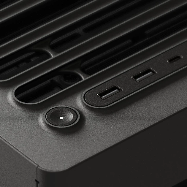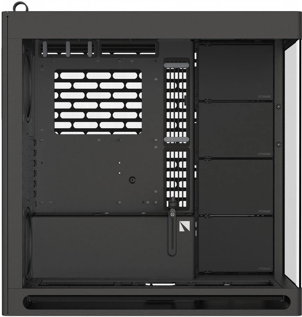 Дзеркальний потік повітря. Додатковий вентилятор у нижній частині задньої панелі спрямовує холодне повітря безпосередньо до відеокарти, ідеально балансуючи впуск і випуск повітря. Це забезпечує максимальну продуктивність і допомагає підтримувати чистоту системи без пилу. Термоформована скляна панель UniSheet для панорамного огляду. Було кинуто виклик обмеженням виробництва, щоб створити найменший можливий радіус вигину та мінімізувати візуальні спотворення, забезпечуючи користувачеві чіткий огляд внутрішньої частини корпусу. SimpliCable Routing System.