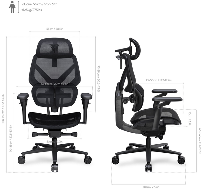 -       Характеристики      Загальні характеристикиОсобливостіМеханізмиМаксимальне навантаженняОсноваРегулюванняГраничний кут нахилу спинкиВисота підлокітників70 - 85 смГарантіяГарантія: 24 місяціГабарити, Колір, ВагаКолірРозміри сидіння (ШхГ), ммВагаШирина500 ммВисота1400 ммГлибина500 ммМатеріалиМатеріал оббивкиМатеріал корпусуКласифікаціяТипДодатковоДодаткові характеристики5D підлокітники- * Характеристики та комплектація товару можуть змінюватися виробником без повідомлення.