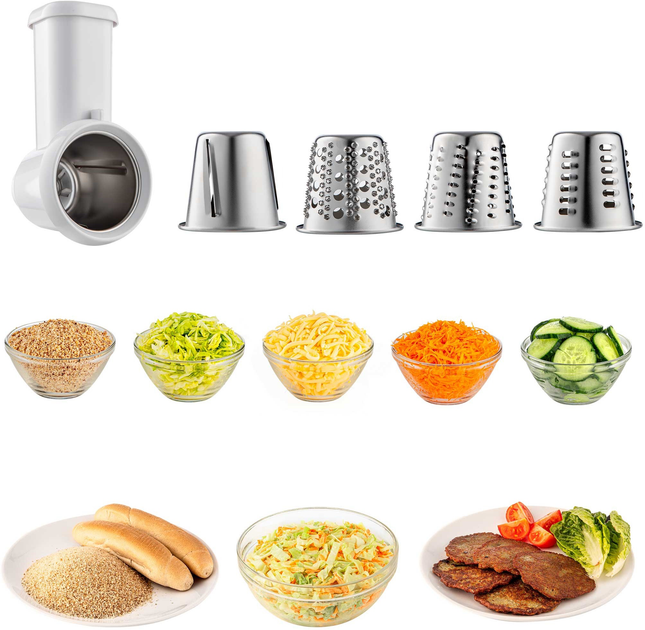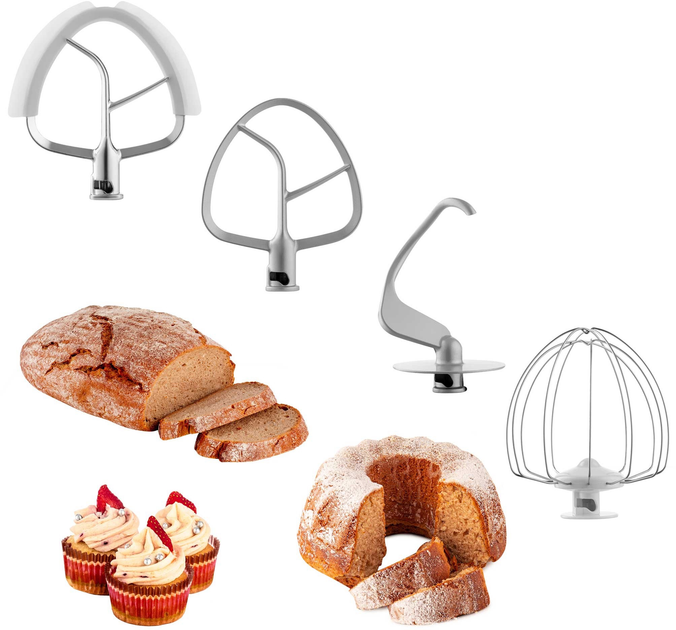 До комплекту входять 12 різноманітних насадок, що відкривають перед вами безмежний простір для кулінарних експериментів. Основна чаша об'ємом 6 літрів, виготовлена з міцного металу, дозволяє готувати великі порції для всієї родини або гостей. Додатково в комплекті йде чаша з нержавіючої сталі об'ємом 3.5 літра з ручкою та мірною шкалою. Серед основних насадок ви знайдете блендер зі скляною чашею об'ємом 1.5 літра та світлодіодним підсвічуванням чаші блендера, який ідеально підходить для приготування смузі, крем-супів та соусів. Комплект включає різні види вінчиків: гнучкий (для суфле), кулястий та плоский, а також гаки для тіста та універсальні тертки/шатківниці. Спеціальний вінчик FLEXI чудово підходить для тонкого тіста, а м'ясорубка дозволяє робити фарш грубого та дрібного помелу. Також в комплекті є насадка для начинки ковбас та форма для печива.