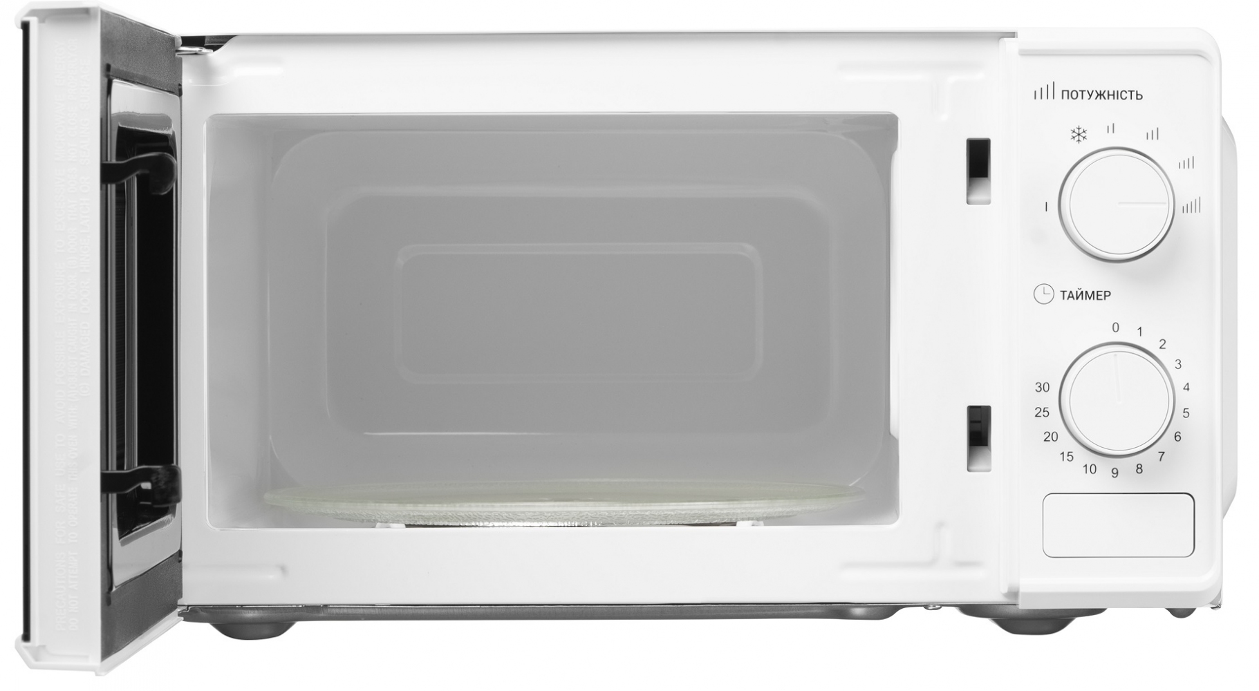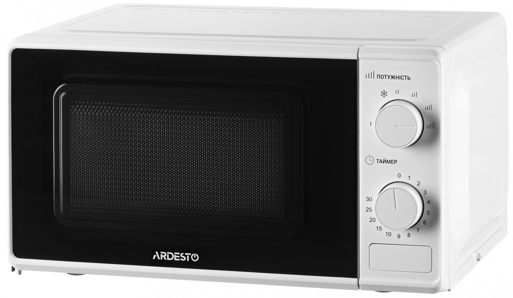 Мікрохвильова піч білого кольору з механічним керуванням Ardesto GO-S724W 20 л 700 Вт має легке керування й бічне відчинення дверцят, обладнана таймером.