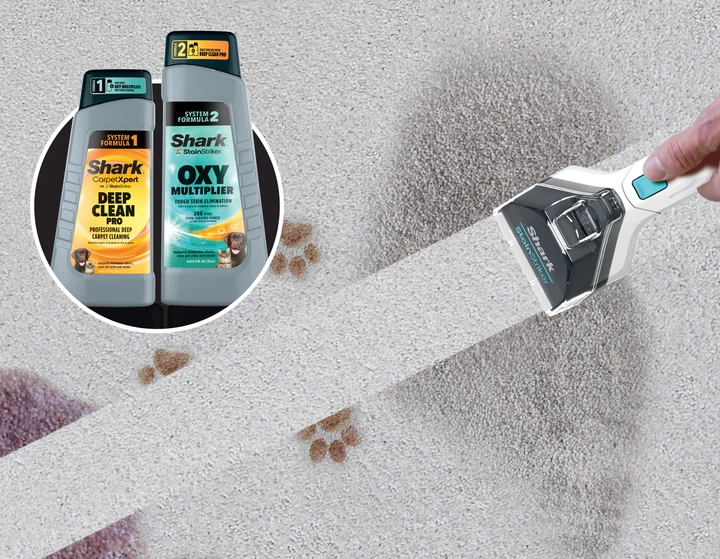 Дві формули Shark поєднуються та активуються для досягнення до 20-кратної потужності видалення плям*. Формула Shark StainStriker OXY Multiplier та формула CarpetXpert Deep Clean Pro змішуються та активуються у вашому засобі для чищення плям StainStriker для боротьби зі стійкими плямами та їх видалення. Видаляє плями та запахи від домашніх тварин, залишків бруду та бруду, розлитої їжі та напоїв тощо.