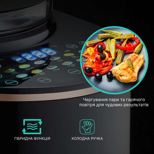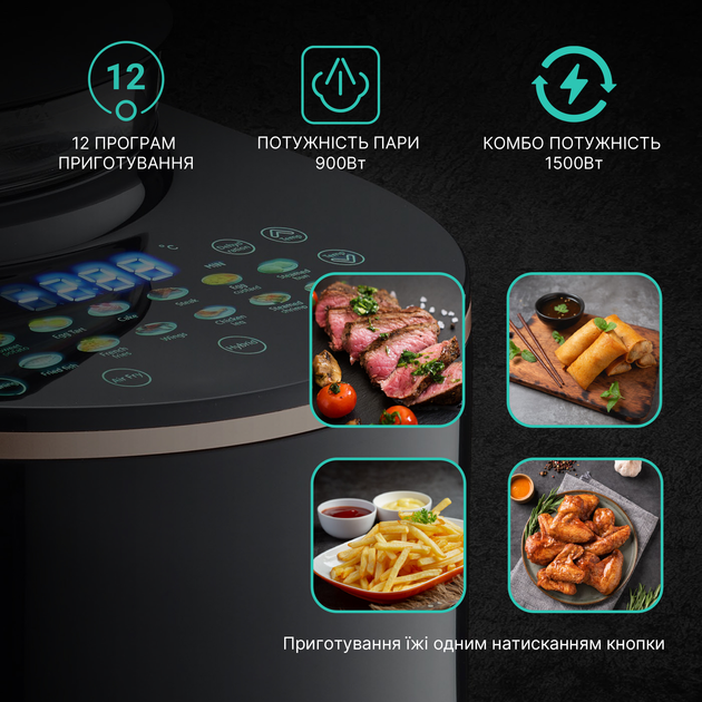 Мультипіч має 12 програм, серед яких основні - приготування м'яса, птиці, риби та картоплі фрі. Додаткові програми включають приготування овочів, що дозволяє експериментувати з різноманітними рецептами. Завдяки функціям відстрочки старту та таймеру, ви можете заздалегідь планувати приготування страв, що особливо зручно для зайнятих людей.