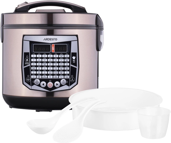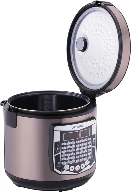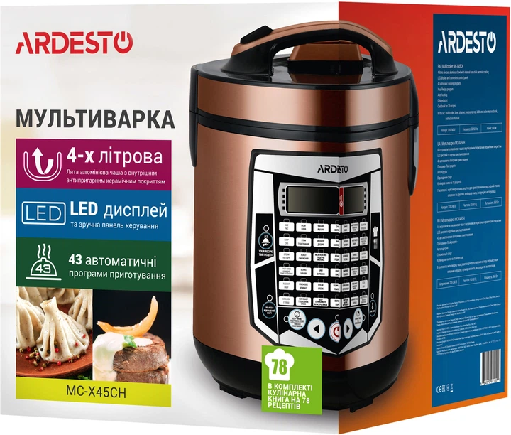Мультиварка Ardesto MC-X45CH з чашею на 4 літри, LED-дисплеєм, функціями відкладеного старту та підігріву, а також 45 автоматичними програмами приготування страв на будь-який смак. Покриття металу кольору шампань, з якого виконаний корпус мультиварки MC-X45CH імітує текстуру шліфованої сталі, а для відкриття кришки конструкції мультиварки передбачена зручна ручка з кнопкою. Ергономічна панель управління оснащена LED-дисплеєм, а для відведення пари та збору конденсату під час приготування є щільний клапан та спеціальний резервуар. Внутрішня частина алюмінієвої чаші покрита надійним керамічним антипригарним покриттям, яке прослужить довгі роки.