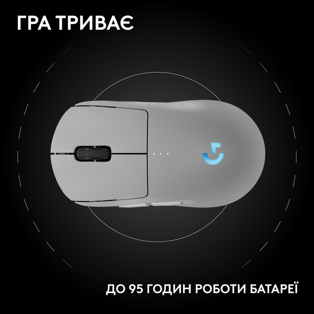 HERO 2. LIGHTFORCE. LIGHTSPEED. Всі вони забезпечують час роботи батареї до 95 годин на одному заряджанні. Швидко заряджайтеся за допомогою USB-C і продовжуйте грати.