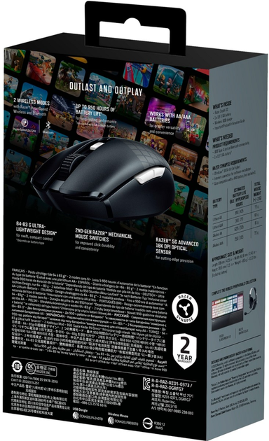 Для роботи потрібна тільки одна батарея AA або AAA. Мишка Razer Orochi V2 оснащена гібридним слотом для батареї, який оптимально розташований для збалансованого розподілу ваги.- * Характеристики та комплектація товару можуть змінюватися виробником без повідомлення.