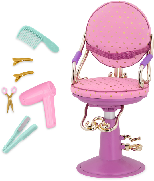 Цей салонний стілець для ляльок оформлений у рожевих тонах, покритий золотими сердечками з фіолетовою основою і є ідеальним доповненням до будь-якого салону краси для ляльок.