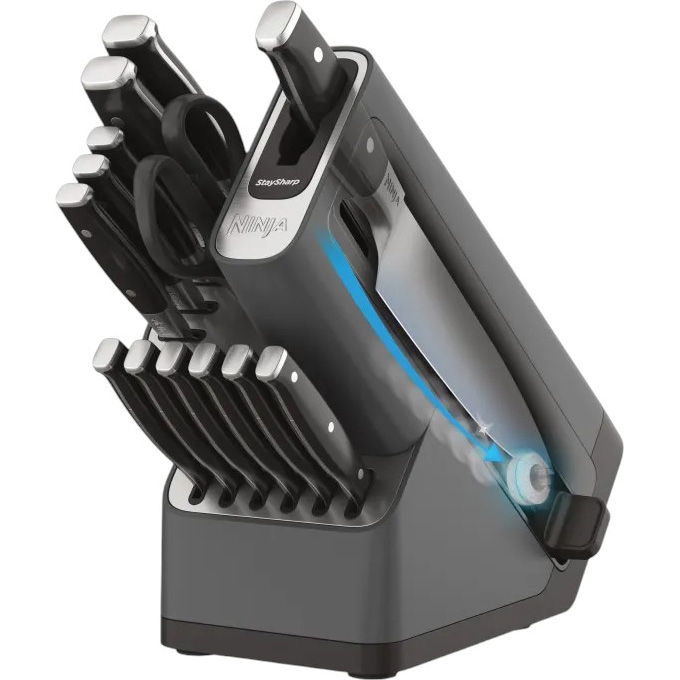 Представляємо розкішне виконання нашої системи ножів Ninja Foodi StaySharp Knife System - тепер у наборі з 14 предметів: 12 основних кухонних ножів, спеціальний блок ножів зі зручною вбудованою точилкою та пара кухонних ножиць, виготовлених з кованої німецької нержавіючої сталі з прецизійними лезами, які прослужать вам довше.