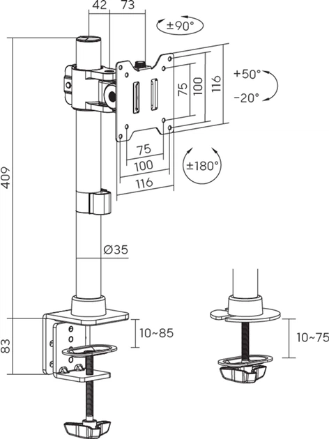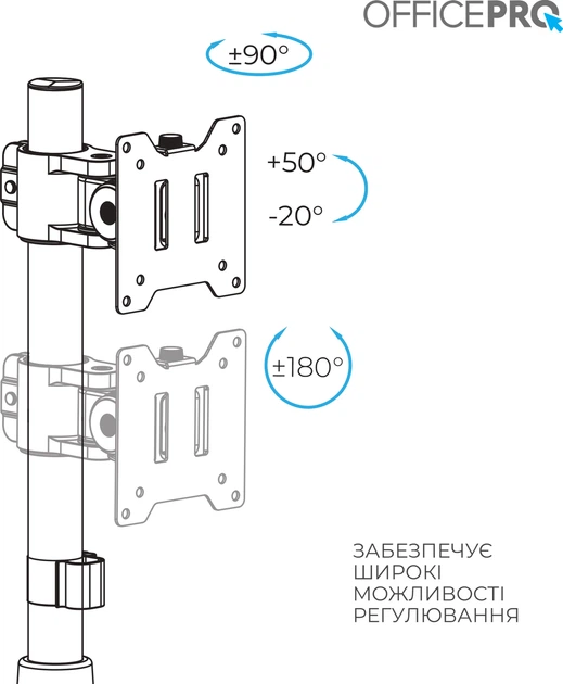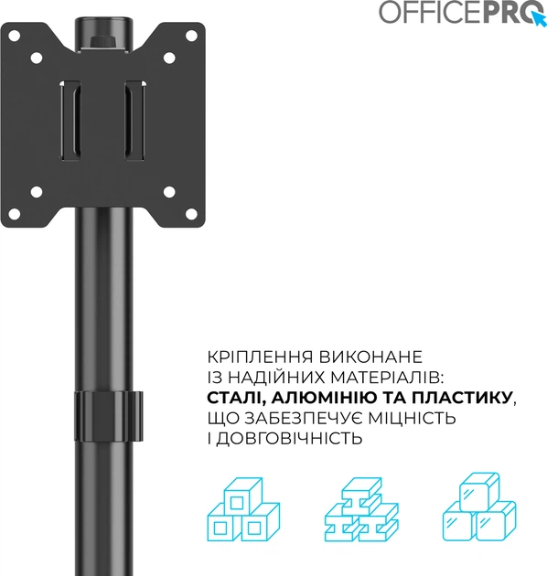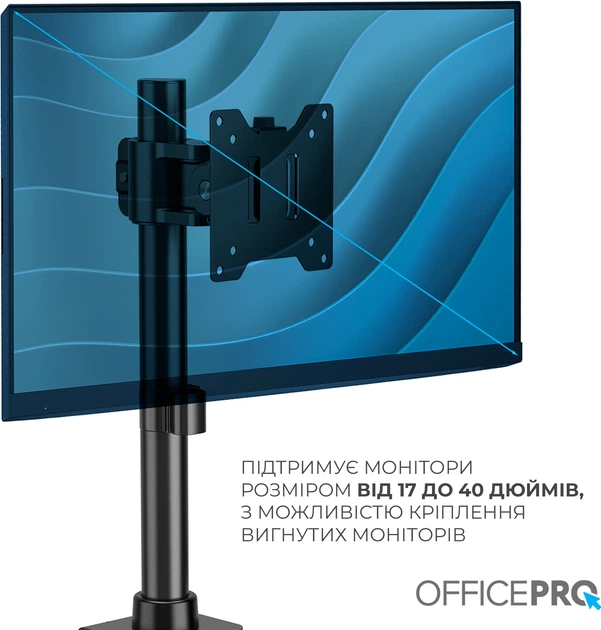 Officepro MA100B - професійне кріплення для монітора з шарнірною конструкцією забезпечує максимальну гнучкість і надійну підтримку навіть для великих екранів. Завдяки високій вантажопідйомності до 20 кг, воно легко утримує монітори діагоналлю до 49 дюймів, включно з вигнутими моделями. Кронштейн дозволяє повністю регулювати висоту, нахил, обертання та кут огляду, що забезпечує комфортну посадку й продуктивну роботу протягом дня. Система швидкого кріплення VESA значно спрощує монтаж і демонтаж. Надміцна конструкція зі сталі, алюмінію та пластику гарантує довговічність і стабільність. Інтегроване управління кабелями допомагає підтримувати порядок на робочому місці. Кріплення легко встановлюється за допомогою затискача або наскрізного отвору, що дозволяє адаптувати його до більшості столів. Поворотний механізм VESA та механізм нахилу забезпечують ідеальний кут огляду в будь-якій ситуації. Це ідеальне рішення для тих, хто цінує функціональність, ергономіку та надійність.