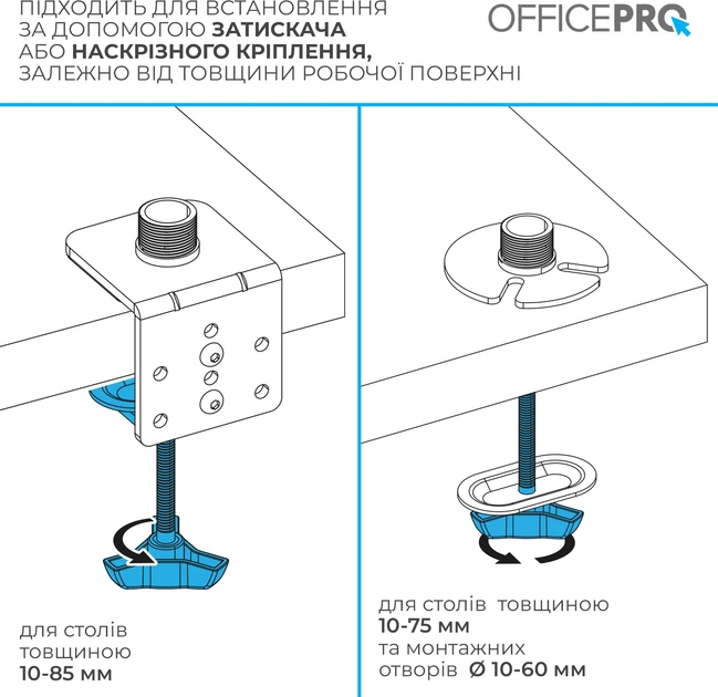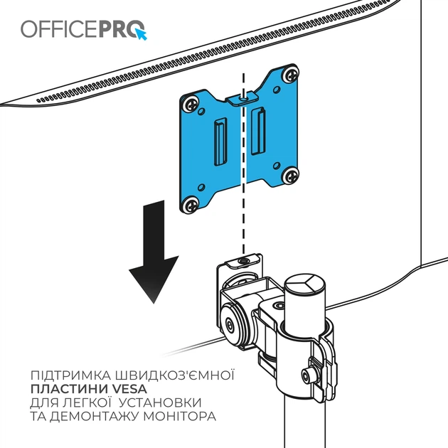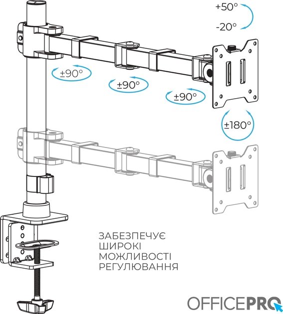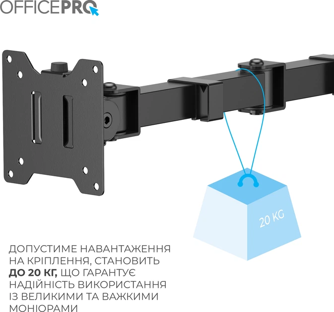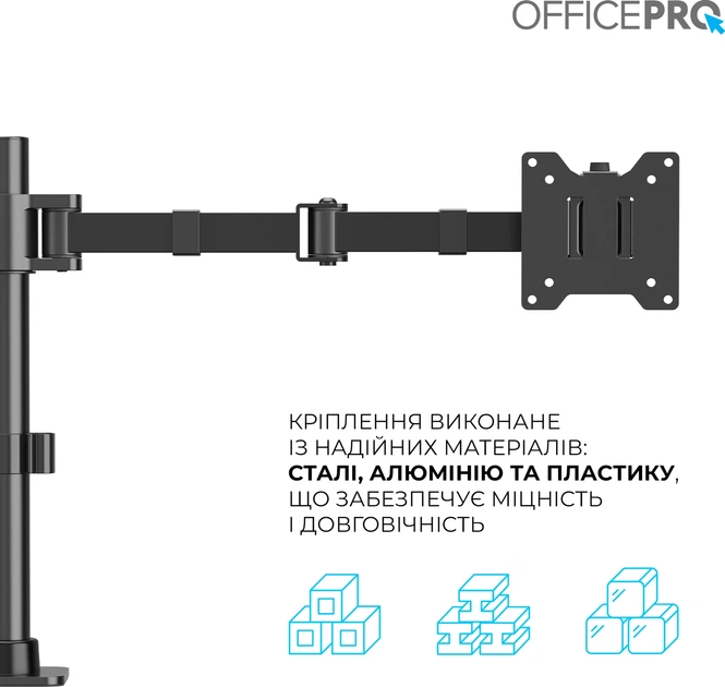 Officepro MA111B - професійне кріплення для монітора з шарнірною конструкцією, розраховане на максимальну надійність і гнучкість. Ця модель легко витримує навантаження до 20 кг, що дозволяє встановлювати навіть 49-дюймові ультраширокі монітори. Кронштейн забезпечує повне регулювання висоти, нахилу, повороту та обертання екрана, допомагаючи знайти ідеальне ергономічне положення для комфортної роботи. Завдяки швидкознімній системі VESA-пластини, монтаж відбувається швидко й без зайвих зусиль. Підходить для вигнутих та пласких екранів розміром від 17 до 49 дюймів. Вільне нахиляння, поворот на 360°, можливість обертання екрана в портретний режим, а також приховане кабельне управління — усе це робить кронштейн незамінним аксесуаром. Конструкція з алюмінію, сталі та пластику з матовим покриттям забезпечує довговічність та стильний вигляд. Підходить для монтажу на стіл за допомогою струбцини або наскрізного отвору. Ідеальне рішення для тих, хто цінує комфорт, продуктивність і порядок на робочому місці.