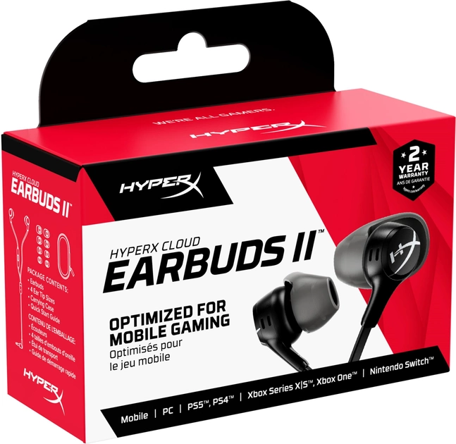 Вам не обов'язково носити важкі навушники з оголів'ям, щоб серйозно ставитись до ігор. Якщо вам подобається якісний звук та зручна портативність, навушники HyperX Cloud Earbuds II – саме те, що вам потрібне. Завдяки 14-міліметровим динамікам, оптимізованим для мобільного аудіо, ви отримаєте відмінний звук під час гри, перегляду відео, прослуховування аудіокниги або подкасту. 4 комплекти оновлених амбушюр допоможуть забезпечити правильне прилягання навушників до вуха. Cloud Earbuds II також має низькопрофільний кабель з кутовим роз'ємом, який допоможе вам уникнути зачіпок, а також зручним жорстким транспортним чохлом. Вбудований мікрофон дозволяє швидко перемикатися з мобільних ігор відповіді на телефонні дзвінки одним натисканням функціональної кнопки. Ці універсальні навушники сумісні з ПК*, Nintendo Switch.