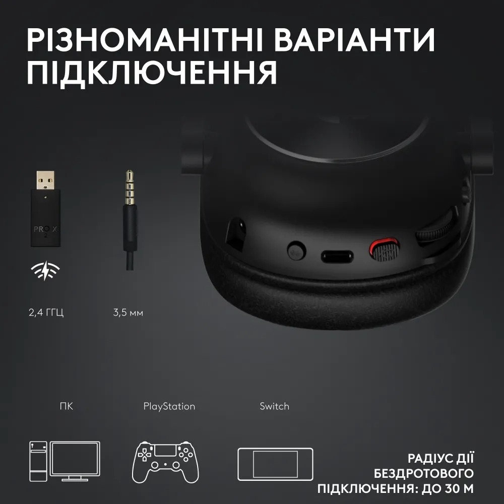 LIGHTSPEED бездротовий, Bluetooth та 3.5-мм аудіокабель для варіантів підключення; включений кабель USB-A до USB-C, донгл USB-A з 3.5-мм портом, аудіокабель 3.5 мм.