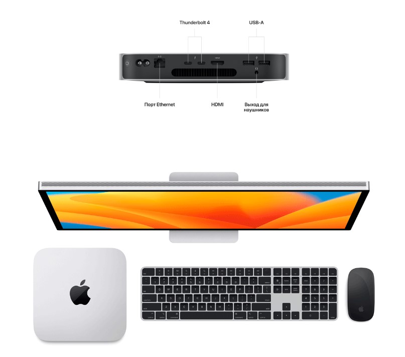 Завдяки двом портам Thunderbolt 4, двом портам USB‑A, HDMI, Wi‑Fi 6E та Gigabit Ethernet Mac Mini можна підключити практично до будь-якого пристрою.