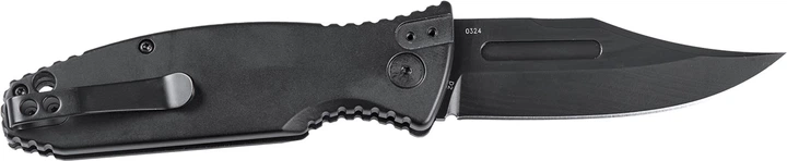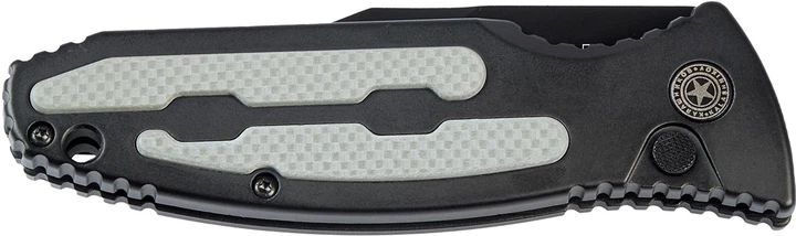 Легко відкривається однією рукою, завдяки автоматичній кнопці. Інтегрований запобіжник захищає ніж від випадкового відкриття. Підпальцеві виїмки, виступи і текстура алюмінієвих накладок на рукояті забезпечують впевнене утримання ножа в будь-якій ситуації. Кишенькова кліпса в положенні tip-up виконана з міцної сталі. На торці розміщено отвір для темляка.
