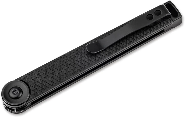 Гвинт з віссю в колір моделі є візуальною відправною точкою моделі типу Gentleman Folder, як символ зміни форми і функції, і закінчується прямим отвором для шнурка на кінці ручки. Текстуроване руків'я з нековзного матеріалу G10 зручно лежить у руці й оснащене практичним глибоким затискачем для перенесення. Поставляється з високоякісним нейлоновим футляром для зберігання.