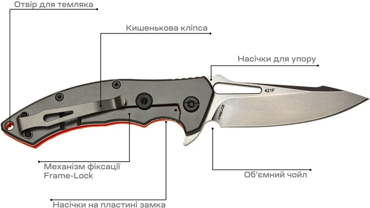 - Характеристики КласифікаціяТипВидГабарити, Колір, ВагаДовжина клинка94 ммКолірПомаранчевийЗагальні характеристикиТвердість клинка58-59 HRCТип замкаFrame LockПоверхня клинкаStonewashПриміткаНожі, представлені в нашому магазині, не належать до холодної зброї за сукупністю характеристик згідно з висновком НДІ ЕКЦ МВС України.ГарантіяГарантія: 6 місяцівМатеріалиМатеріал клинка9Cr18MoV