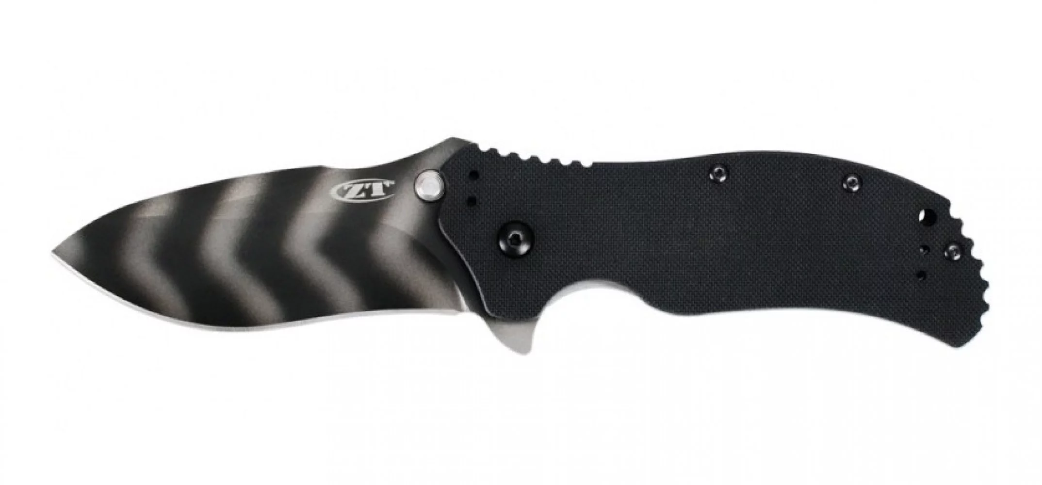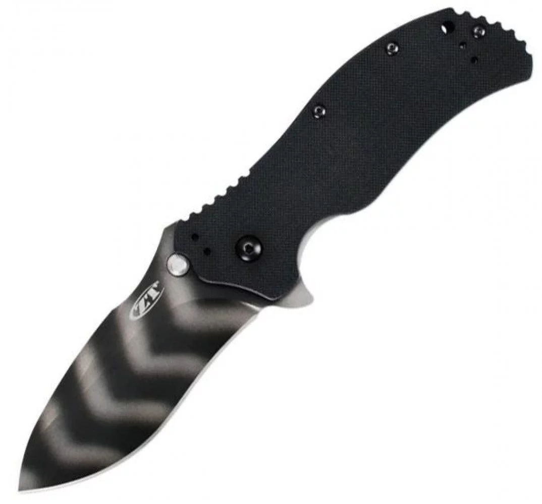 Складаний ніж із помічником відкриття SpeedSafe та незвичайною чорно-білою розмальовкою клинка – це Zero Tolerance 0350TS. Він трохи менше, ніж популярна модель ZT0300, але це робить його легшим, без втрати міцності конструкції та більш придатним для повсякденних завдань. Клинок виготовлений із твердої порошкової сталі CPM-S30V з рідкісним фінішним покриттям "тигрові смуги" (Tiger Stripes), як назвали його виробники. Обробка DLC характеризується тим, що надає поверхні клинка не лише привабливого закінченого вигляду, але й додатково захищає від іржі та механічних пошкоджень.