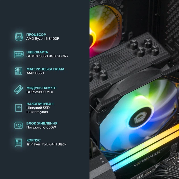 - Характеристики ЖивленняПотужність БЖ650 ВтГабарити, Колір, ВагаШирина365 ммВисота423 ммГлибина210 ммЗагальні характеристикиГарантіяГарантія: 12 місяцівКомплект поставкиКомп'ютер , ДокументаціяДисплейТип дисплеяПроцесорПроцесорAMD Ryzen 5 8400F , 4.2 - 4.7 ГГц , ШестиядернийФункції пам'ятіОб'єм оперативної пам'ятіТип пам'ятіНакопичувачОб'єм накопичувача1 ТБГрафікаТип відеокарти і об'єм відеопам'ятіGeForce RTX 5060 , 8 ГБ , Дискретна
