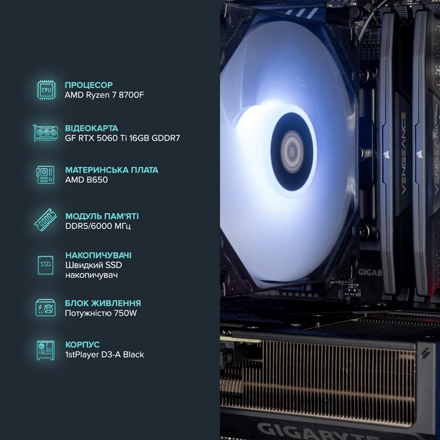 - Характеристики ЖивленняПотужність БЖ750 ВтГабарити, Колір, ВагаШирина375 ммВисота400 ммГлибина230 ммЗагальні характеристикиГарантіяГарантія: 12 місяцівКомплект поставкиКомп'ютер , ДокументаціяДисплейТип дисплеяПроцесорПроцесорAMD Ryzen 7 8700F , 4.1 - 5.1 ГГц , ВосьмиядернийФункції пам'ятіОб'єм оперативної пам'ятіТип пам'ятіНакопичувачОб'єм накопичувача1 ТБГрафікаТип відеокарти і об'єм відеопам'ятіGeForce RTX 5060 Ti , 16 ГБ , ДискретнаОпераційна системаОС