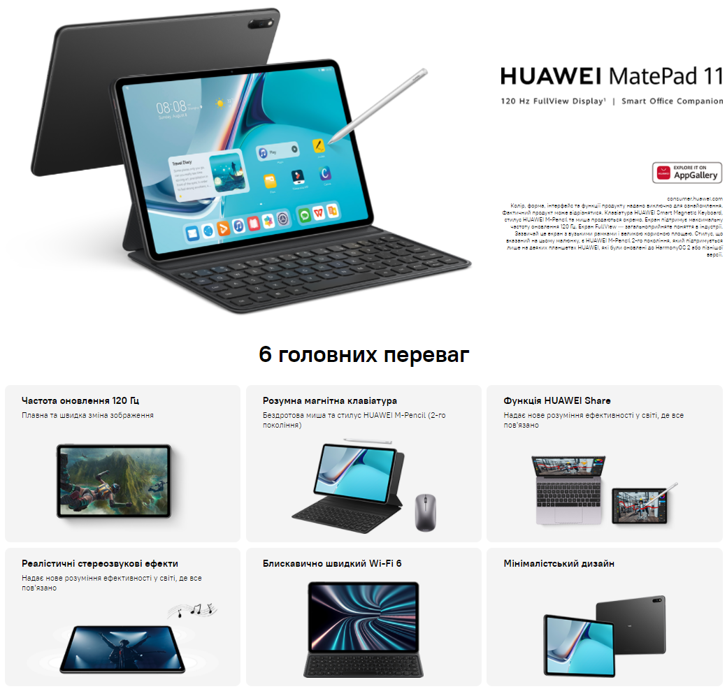 Планшет Huawei MatePad 11 отримав чіткий екран з частотою оновлення 120 Гц. Сертифікат TÜV Rheinland свідчить про високий рівень захисту зору від мерехтіння і синього випромінювання. При підключенні планшета до комп'ютера можливо швидке переміщення файлів між пристроями. Використання клавіатури, миші і стилуса M-Pencil перетворюють витончений планшет в багатофункціональний пристрій, який за продуктивністю і швидкодією не поступається ПК.