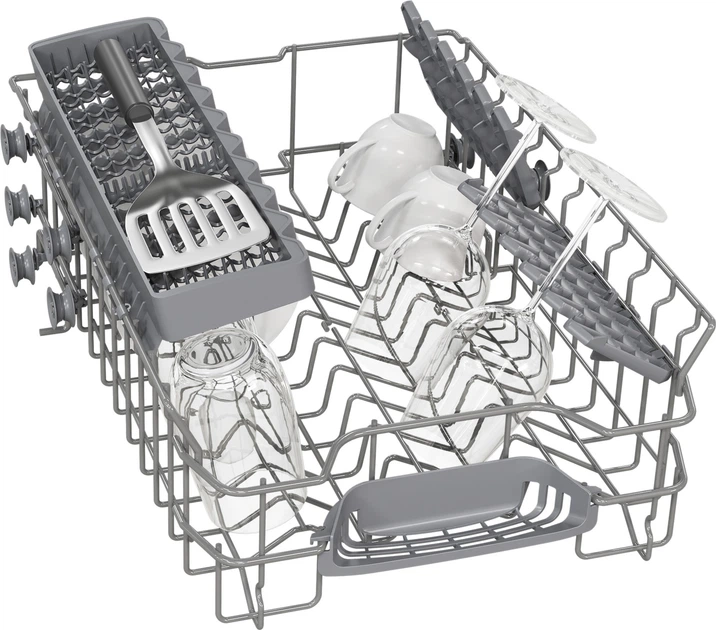Bosch SPS2IKW55K підтримує 6 основних програм: інтенсивна 70°, еко 50°, скло 40°, експрес 65° (1 година), експрес 45° і режим очищення приладу. Крім того, є функція Улюблена, яка дозволяє зберігати часто використовувані налаштування. Машина також пропонує додаткові можливості — такі як SpeedPerfect (скорочення тривалості циклу), гігієнічне миття з високою температурою та опція додаткового сушіння.