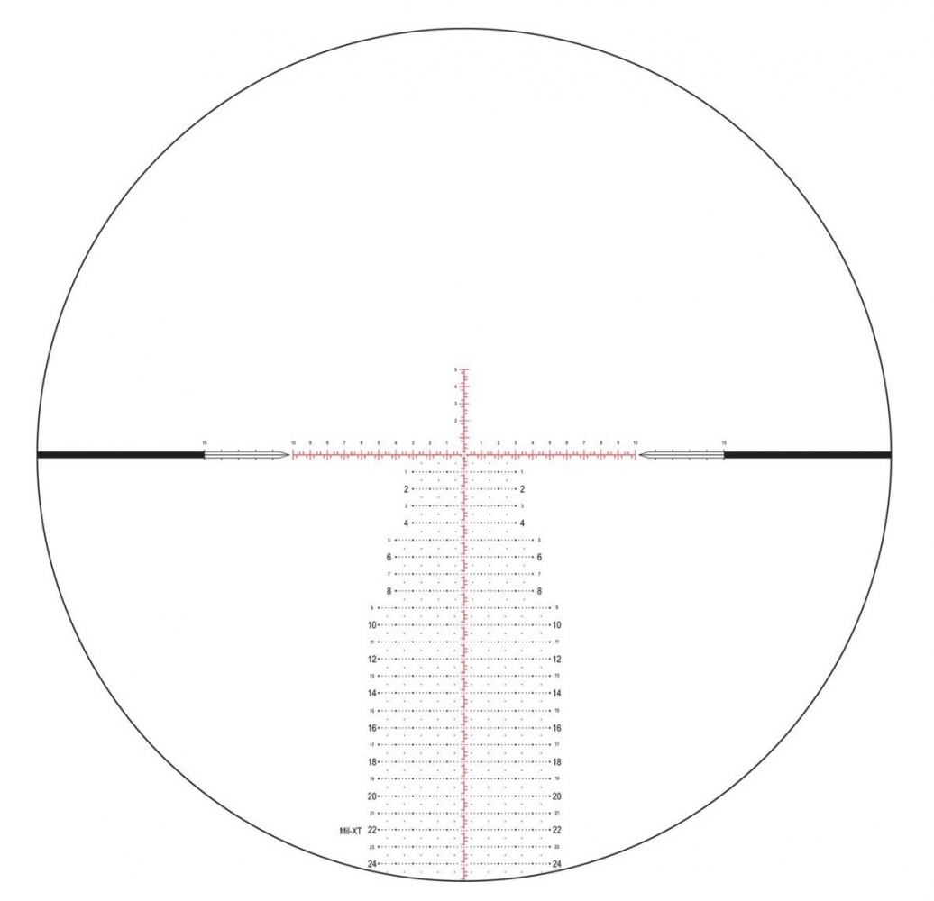 Прицільна сітка MIL-XT з підсвічуванням, розташована в першій фокальній площині, спеціально розроблена для високоточної змагальної стрільби на далекі дистанції і дозволяє чітко оцінити ціль. Основною перевагою такої схеми є те, що ділення на прицільній марці на будь-який кратності мають справжнє значення.
