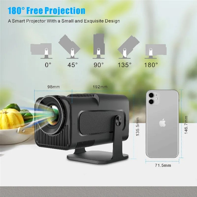 H96MAX HY320 пропонує максимальну адаптивність - розміщуйте його на відстані від 1 до 4 метрів від екрана та легко переносьте проєкцію на стіни на стелю. Ергономічна конструкція проєктора підтримує обертання на 180 градусів, що дозволяє проєктувати під кутами 0°, 45°, 90°, 135° та 180°.