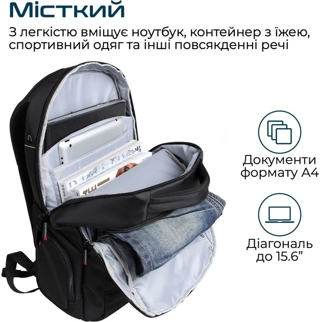 - Місткий: Rebel-BP з легкістю вміщує ноутбук 15.6", документи формату А4, контейнер з їжею, спортивний одяг та інші повсякденні речі.