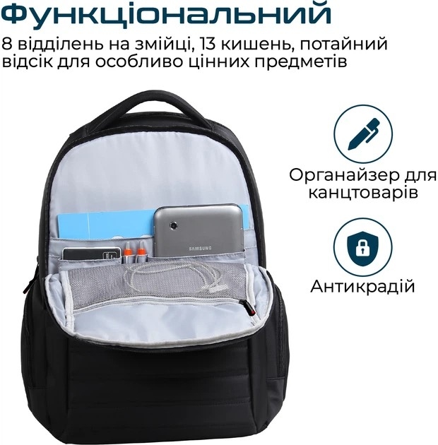 - Стильний дизайн: Привабливий зовнішній вигляд в класичному чорному кольорі, рюкзак ідеально впишеться в урбаністичний стиль життя.