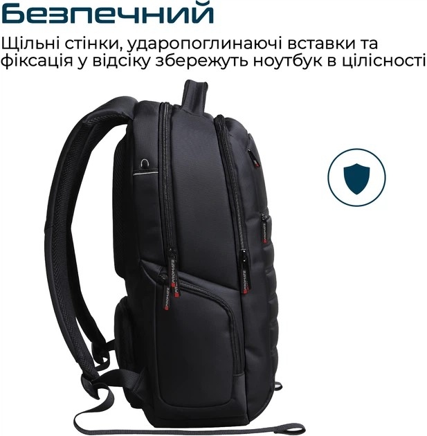 - Безпечний: Щільні стінки, ударопоглинаючі вставки та надійна фіксація у відсіку збережуть ноутбук в цілісності.