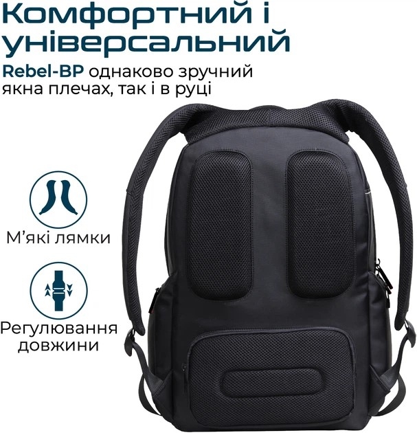 - Комфортний і універсальний: М'які лямки з регулюванням довжини та ручка для перенесення — Rebel-BP однаково зручний як на плечах, так і в руці.