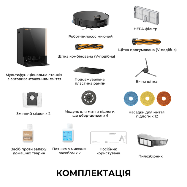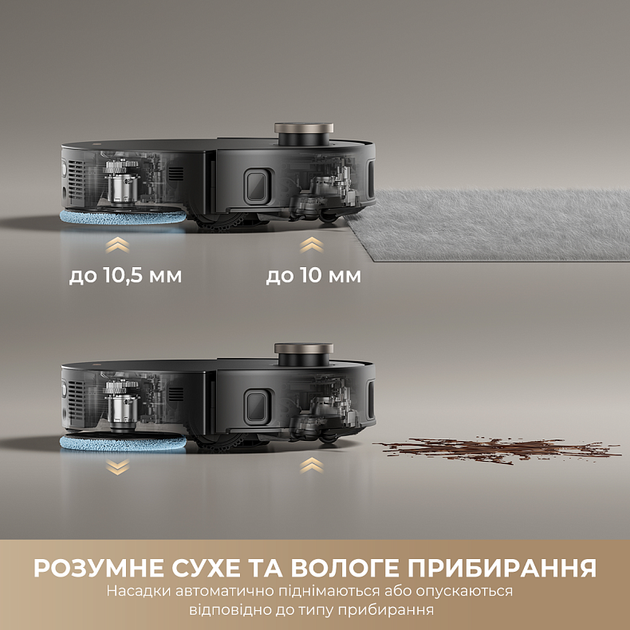 - Характеристики Загальні характеристикиОбсяг контейнера для води5500 млРежими рухуУправління рухом робота , Зигзагом , Лінійно за площею , Уздовж перешкоди , По спіралі , Повторює пройдений відрізок , Не повторює пройдений відрізокКількість бічних щіток1Звітність роботи в смартфоніЧас останнього прибирання , Рухи робота на мапі , Журнал прибирань , Контроль зношування аксесуарів , Площа останнього прибиранняВисота подолання порогів80 ммТип вологого прибиранняВологе прибирання фізичним впливом на підлогуСистема навігаціїLiDARПлоща прибирання100 м²Максимальний час роботи на одному заряді210 хвУправлінняНа корпусі , Через смартфонРозумна навігаціяЗ розумною навігацієюТехнологіїРозпізнавання перешкод , Розумна навігація , Безпека на сходах , Повернення на базу з будь-якої кімнати , Уникнення килимів під час вологого прибирання , Побудова карти приміщення , Продовження прибирання після підзаряджання , Посилення потужності на килимахКонструкціяГарантіяГарантія: 24 місяці від виробникаТип прибиранняПотужність всмоктуванняСпоживана потужність70 ВтОб'єм пилозбірника0.3 лТип фільтраРівень шумуНасадки та щіткиV-подібна плаваюча турбощітка , Насадки з мікрофібриРегулювання потужностіКомплектаціяПляшка з мийним засобом - 2 шт , Модуль для миття підлоги, що обертається х 6 , Подовжувальна пластина рампи , Бокова щітка , Робот-пилосос , HEPA фільтр , Кабель живлення , Насадки , Пилозбірник , ІнструкціяФункціїФункції зі смартфонаВибір режиму руху , Вибір території/кімнат для прибирання , Встановлення на заряджання , Регулювання потужності всмоктування , Регулювання потужності подавання води , Встановлення віртуальних стін , Встановлення розкладу прибиранняЖивленняАкумуляторLi-Ion 6400 mAhЖивленняРештаПокриттяКилим з високим ворсом , Килим з низьким ворсом , Ковролін , Ламінат , Лінолеум , Паркет , ПлиткаГабарити, Колір, ВагаКолірГабарити (ВхШхГ)68.1 х 52.5 х 51.1 смВага4.57 кгКласифікаціяТип пилососа