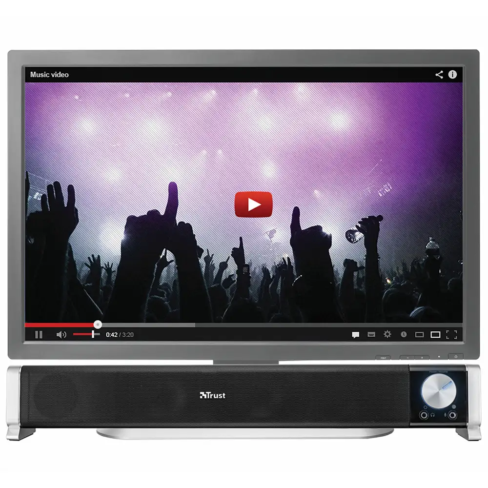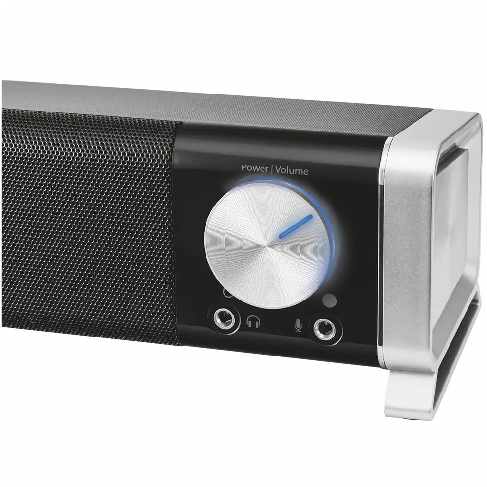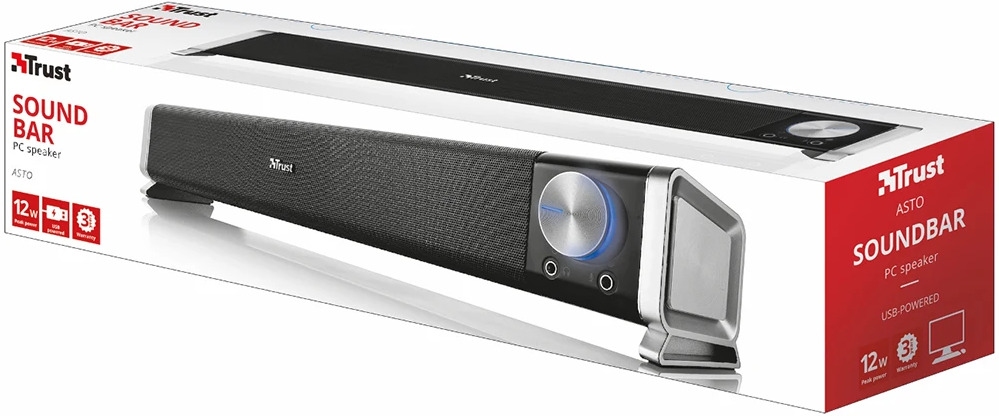 Саундбар TRUST Asto Sound Bar PC Speaker. Насичений звук, незважаючи на компактний розмір, дозволяє розмістити динамік під монітором будь-якого ПК. Велика підсвічена ручка регулювання гучності. Зручні роз'єми на передній панелі для підключення навушників та мікрофона. Працює від USB, розетка не потрібна.