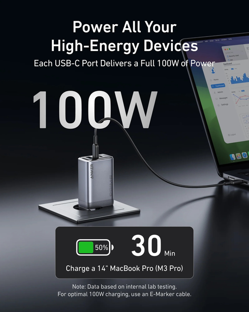 З ANKER GaNPrime Charger ви отримуєте 100 Вт потужності для миттєвого заряджання через два порти USB-C та один порт USB-A. Легко заряджайте ноутбук, смартфон і планшет одночасно без втрат швидкості.Максимальна ефективність USB-C