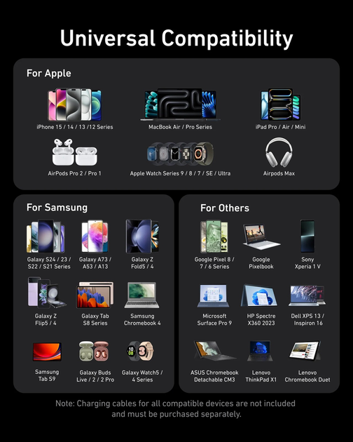 - Універсальна сумісність — від MacBook і iPhone до Android, планшетів, ноутбуків і аксесуарів