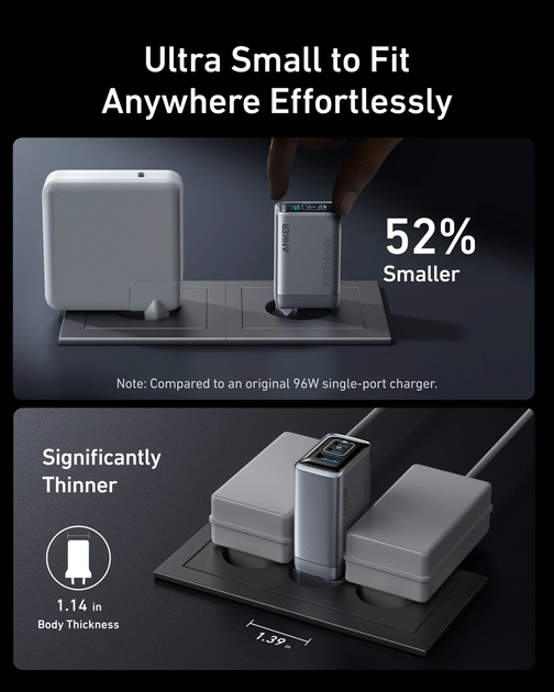 Товщі штекери для кращого кріплення, міцний корпус і протиударна конструкція забезпечують надійне, стабільне з'єднання без випадкових вимкнень.Anker GaNPrime — це флагманська серія зарядних пристроїв, створена на основі новітньої технології GaN (нітрид галію), яка забезпечує виняткову енергоефективність, компактність і швидкість заряджання. Завдяки комбінації інноваційних рішень PowerIQ 4.0 та ActiveShield 2.0, пристрої GaNPrime автоматично адаптуються до кожного під'єднаного гаджета, забезпечуючи максимально швидке, безпечне та збалансоване заряджання: