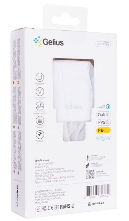 Зарядний пристрій Gelius Stratus 45W оснащений сучасною технологією GaN та підтримує швидкі стандарти заряджання PD та QC 3.0. Завдяки цьому він забезпечує стабільне та ефективне поповнення енергії смартфонів, планшетів та інших гаджетів, включно з Android і iOS-пристроями.