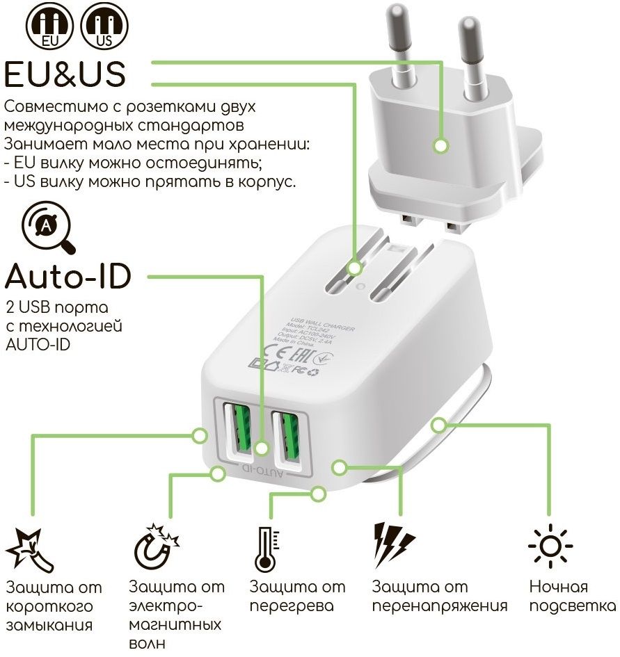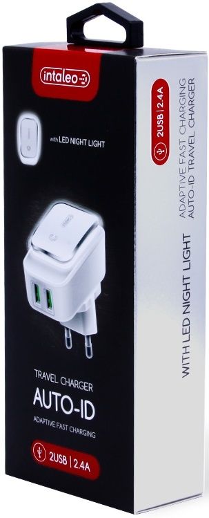 Мережевий зарядний пристрій підвищеної потужності Intaleo TCG242 з LED-нічником, двома USB-виходами та інтелектуальним керуванням живлення AUTO-ID.