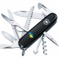 Швейцарський складаний ніж із патріотичної лінійки HUNTSMAN UKRAINE. Модель Huntsman - це кишеньковий ніж Victorinox середнього розміру - 91 мм. Глянцеві чорні накладки доповнені картою державних кордонів України в кольорах національного прапора. Справжня мультизадачність - цілих 15 функцій - у компактному форматі. Модель містить круту пилку по дереву, ножиці зі зручним пружинним механізмом і два дуже гострі леза (велике і маленьке). Дві відкривачки (для пляшок і консервних банок) комбіновані з плоскими викрутками (3 і 6 мм) на кінці. З іншого боку - багатоцільовий гачок, штопор і шило з вушком для шиття. Класичний набір із пінцета і пластикової зубочистки в торцях накладок.