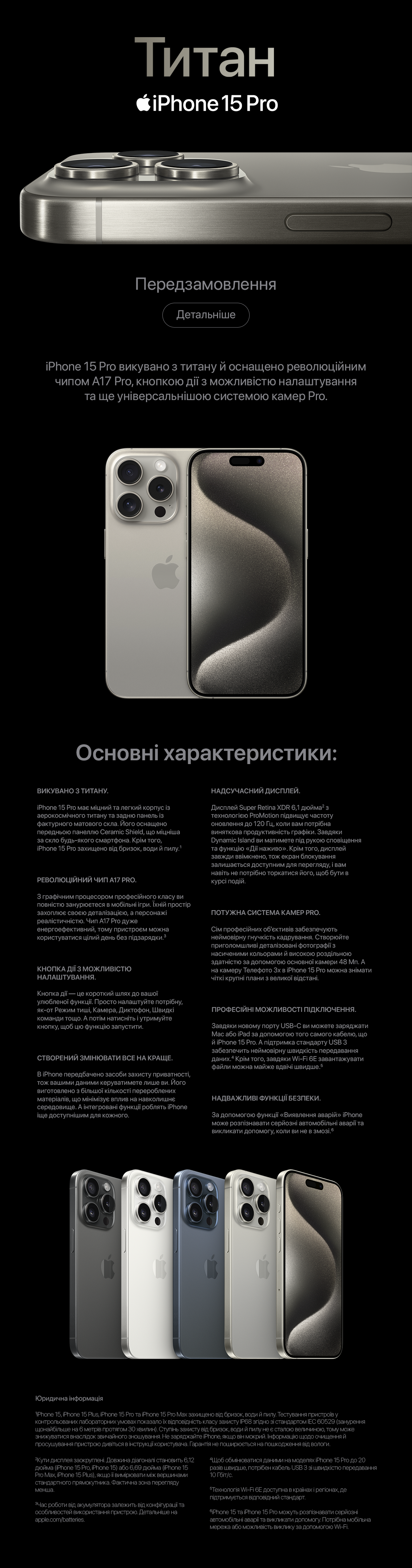 - Характеристики Загальні характеристикиРозблокування за допомогою обличчяТакТип пристроюСмартфонФорм-фактор телефонуСенсорний моноблокГарантіяГарантія: 12 місяцівРобота з повідомленнямиSMS , MMS , E-mailКомплект поставкиСмартфон , Кабель для синхронізації , Інструкція , Гарантійний талонГабарити, Колір, ВагаШирина76.7 ммВисота159.9 ммТовщина8.25 ммКолірДодатковоДодаткові характеристикиАкселерометр , Гіроскоп , Датчик освітлення , Датчик наближення , Компас , Барометр , Face IDСигнали викликуПоліфонічні мелодії , Вібровиклик , MP3 в якості дзвінкаОрганайзерГодинник , Таймер , Калькулятор , Світовий час , Секундомір , Календар , Нотатки , БудильникСканер відбитків пальцівДисплейДисплей6.7" , сенсорний ємнісний , Multi-TouchРоздільна здатність екрану2796x1290Матеріал екрануСклоСІМ-карткиКількість SIM-картФункції пам'ятіКількість записів телефонної книгиОбмежено пам'ятю самого пристроюОб'єм вбудованої пам'ятіПідтримка карт пам'ятіСтандарт зв'язку/інтернетСтандартGSM , UMTS , WCDMA , LTE , 5GІнтернет5G , HSUPA , GPRS , EDGE , 3G , 2G , HSDPA , 4GБездротові технологіїНавігаціяПроцесорПроцесорA17 ProКількість ядерОпераційна системаОпераційна системаОсновна камераОсновна камера48 Мп + 12 Мп + 12 Мп + 12 МпЗапис відео основної камери4K , 3840x2160 , стереозвукФронтальна камераФронтальна камера12 МпМатеріалиЖивленняТип акумулятораМожливість бездротової зарядкиШвидка зарядкаЗнімна АКБ