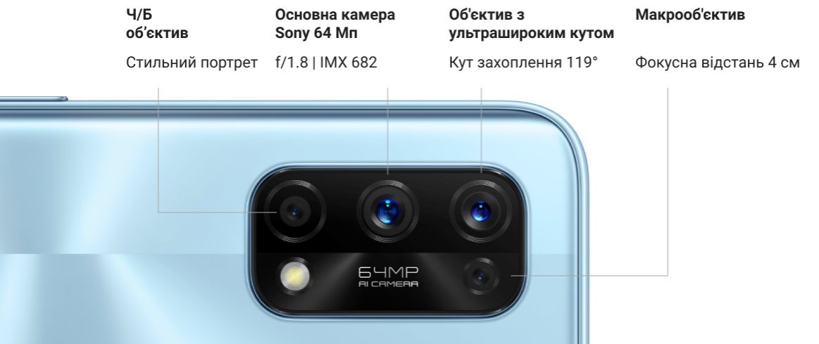 Знімайте як профі з realme 7 Pro. Смартфон отримав систему камер Pro Quad Camera, що складається з 4 об'єктивів. Вона дозволяє фотографувати з 20-кратним зумом і робити як вражаючі панорами, так і дивовижні макрознімки. При цьому 64-мегапіксельна основна камера забезпечує чіткість зображення в 4 рази вище, ніж у 4K ТВ - 9280 x 6944 пікселів - що робить кожне фото неймовірно детальним.