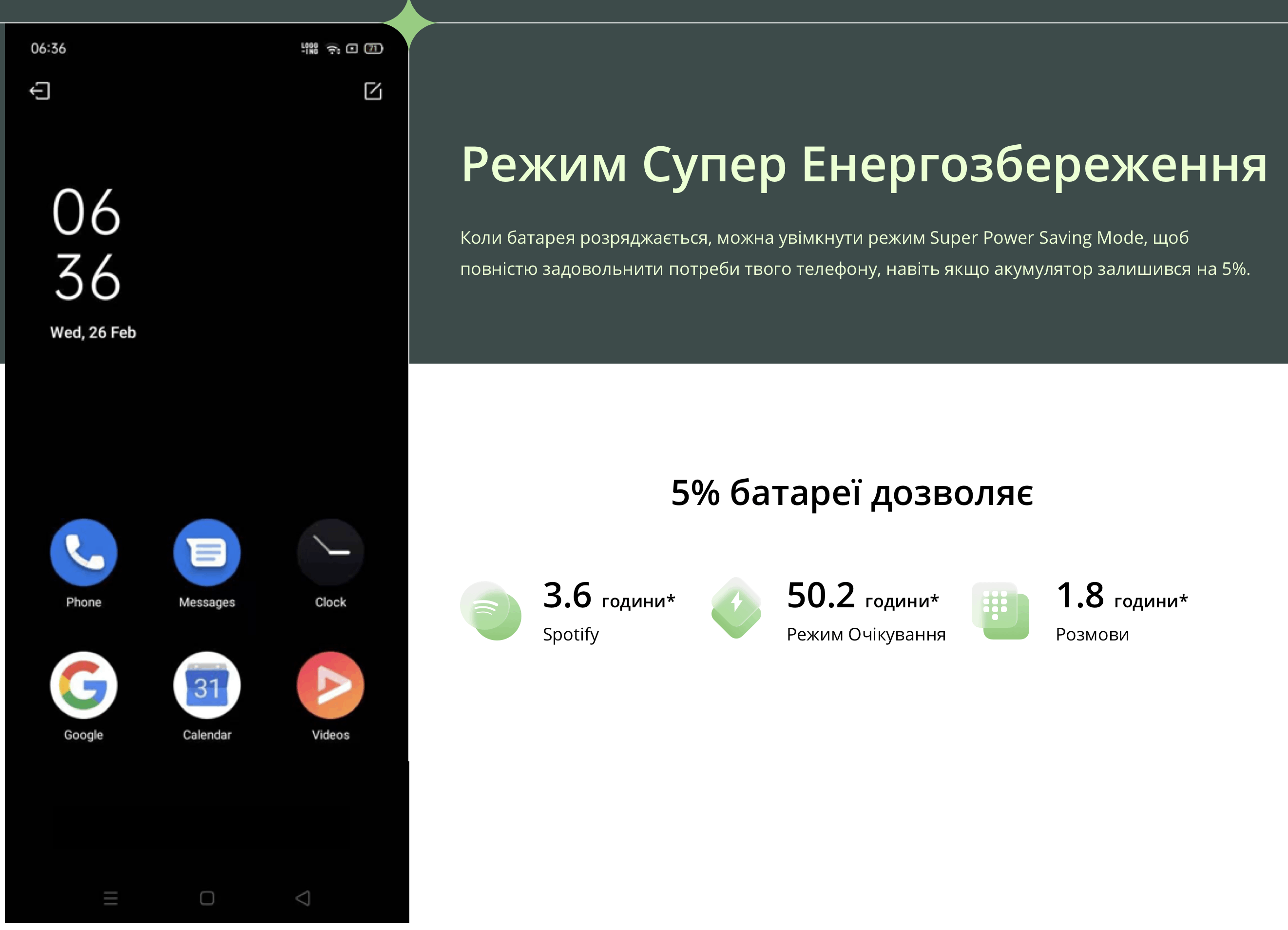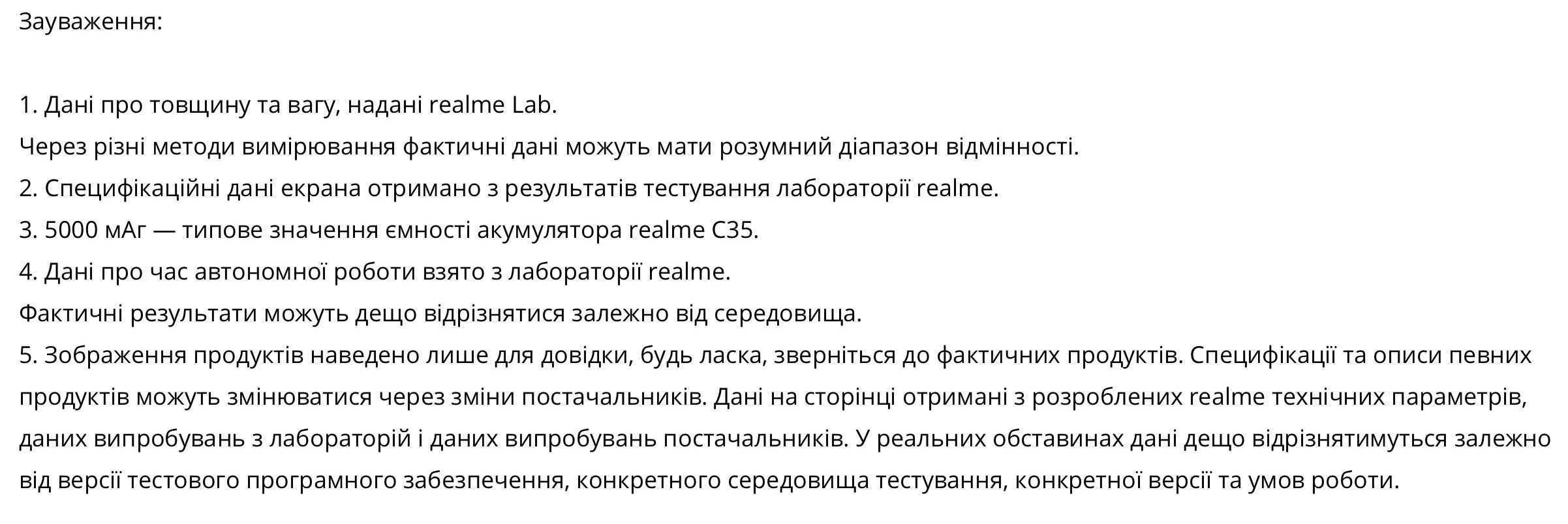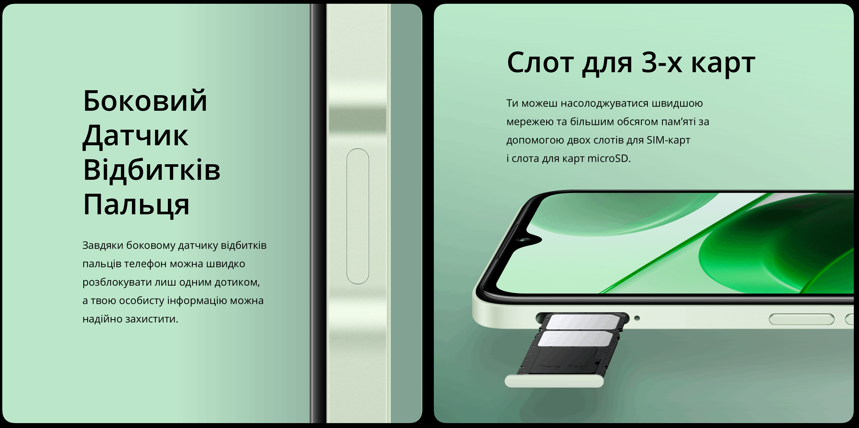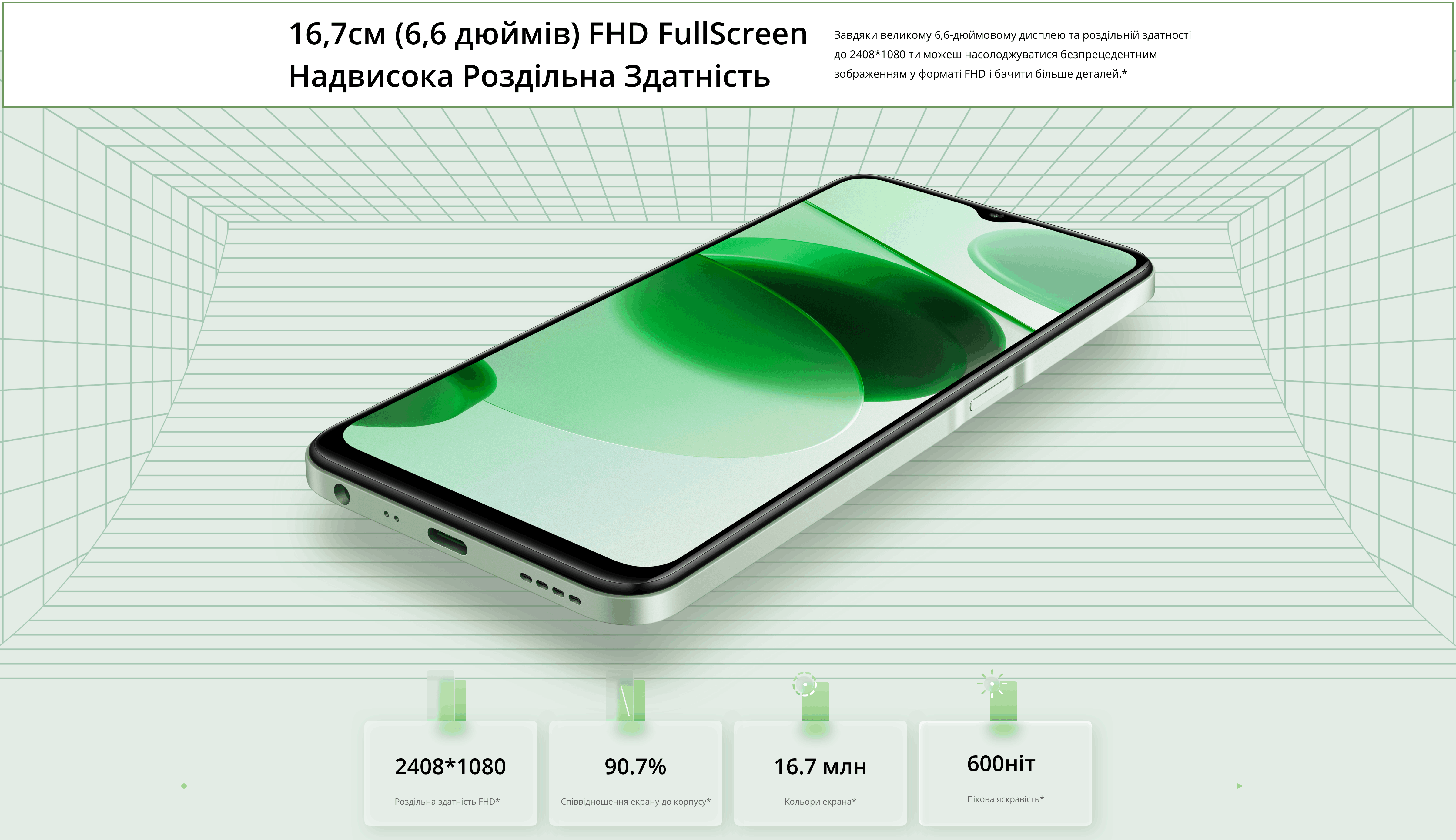 - Характеристики Загальні характеристикиТип пристроюСмартфонФорм-фактор телефонуСенсорний моноблокГарантіяГарантія: 12 місяців від виробникаРобота з повідомленнямиSMS , MMS , E-mailКомплект поставкиКабель USB , Зарядний пристрій , Смартфон , Інструкція , Гарантійний талонГабарити, Колір, ВагаШирина75.6 ммВисота164.4 ммТовщина8.1 ммКолірДисплейДисплей6.6" , сенсорний ємнісний , Multi-TouchРоздільна здатність екрану2408x1080Матеріал екрануСкло (Gorilla Glass)ДодатковоСигнали викликуПоліфонічні мелодії , Вібровиклик , MP3 в якості дзвінкаОрганайзерГодинник , Таймер , Калькулятор , Світовий час , Секундомір , Календар , Нотатки , БудильникСканер відбитків пальцівПідтримка OTGТакСІМ-карткиКількість SIM-картРозміри СІМ-картиТип роз'єму СІМ-картиФункції пам'ятіКількість записів телефонної книгиОбмежено пам'ятю самого пристроюОб'єм вбудованої пам'ятіОперативна пам'ятьПідтримка карт пам'ятіСтандарт зв'язку/інтернетСтандартGSM , 2G , 3G , 4GІнтернетHSUPA , GPRS , EDGE , 3G , 2G , HSDPA , 4GБездротові технологіїНавігаціяПроцесорПроцесорUnisoc Tiger T616Кількість ядерЧастота процесора2.0 ГГц + 1.8 ГГцОпераційна системаОпераційна системаОсновна камераОсновна камера50 Мп + 2 Мп + 0.3 МпФронтальна камераФронтальна камера8 МпМатеріалиМатеріал корпусуЖивленняЄмність акумулятора5000 мА*годШвидка зарядкаЗнімна АКБ