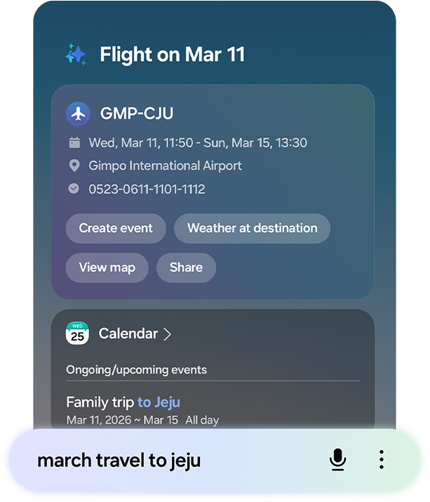 Деталі бронювань і записів на зустрічі можна знайти за лічені секунди, використовуючи звичайну мову. Скористайтесь Finder на головному екрані для пошуку інформації, наприклад, щодо підготовки до майбутньої подорожі (дані про рейси та збережені нагадування чи нотатки). Один пошук об'єднує все, допомагаючи вам згадати, де знаходяться необхідні речі.